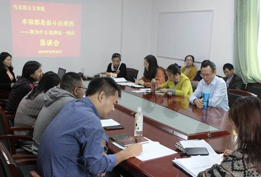 思与法教研室副教授刘宗劲老师,以《换一张笑脸》为题,讲述了自己对教师岗位的坚定选择,“我们生活在最好的时代,生于这个时代的中国,才让我们有机会有平台去选择从事最热爱的事业,这就是人生的幸福”;纲要教研室主任王晨博士回顾,是三代从教的“教师世家”熏陶、师恩影响、教师的崇高使命等原因,促使他选择了更直接地体现人生价值的教师岗位;马克思主义中国化教研室张先梅副教授认为,幸福来源于员工的成长,来源于教育的成果,来源于作为教师的专业能力和敬业精神;青年教师陈思思的幸福感来源于对教师岗位深沉地热爱:“世界上还有哪一种职业能够这么近距离的与那么多纯洁的心灵接触呢?与人的心灵打交道是一门使人上瘾的艺术。”