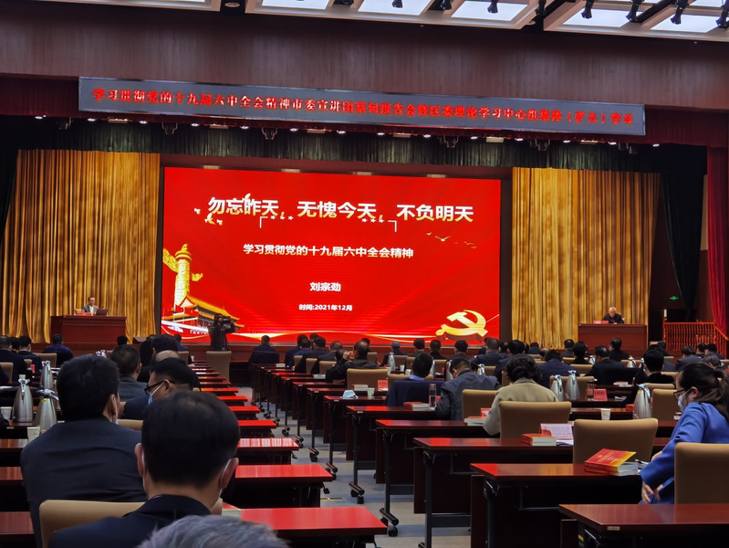 按照武汉市委讲师团安排,中共武汉市委宣讲团成员、公司副经理刘宗劲于2021年12月10日下午为蔡甸区委举办的“学习贯彻党的十九届六中全会精神市委宣讲团蔡甸报告会暨区委理论学习中心组集体(扩大)学习”做了一场题为“勿忘昨天,无愧今天,不负明天——学习贯彻党的十九届六中全会精神”的理论宣讲,蔡甸区委、区人大常委会、区政府、区政协领导班子成员,中法城管委会常务副主任,区法院、区检察院主要负责人等参加了会议。会议由蔡甸区委书记陈新垓主持。