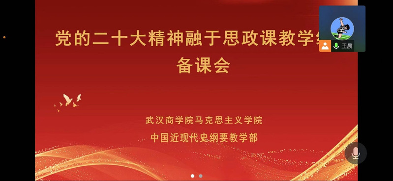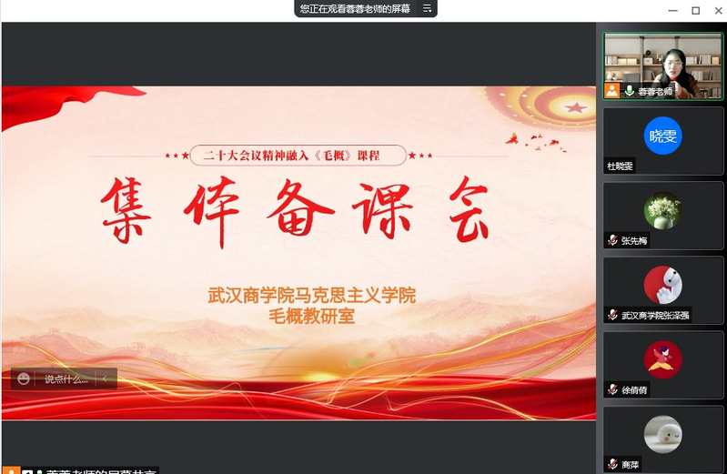 “党的二十大精神融入毛泽东思想和中国特色社会主义理论体系概论课” 集体备课会于2月14日以线上方式举行。教学部主任王蓉蓉老师首先对本学期“毛泽东思想和中国特色社会主义理论体系概论”课的教学安排、教学要求和教学内容进行了详细说明,同时就2023新版教材“导论、第一章”两个教学专题进行了分析讲解,梳理了教学重点和难点。余志涛老师就如何将党的二十大精神融入思政课堂、融入什么内容以及如何融入分享了自己的看法,张先梅老师对于马克思主义中国化时代化的理论成果及其关系作了分享,商萍老师从如何融入的问题作了交流,认为可以采用专题式教学,以更好回答中国之问、世界之问、人民之问、时代之问。张泽强老师和吴昊老师表示此次备课会获益匪浅,为党的二十大精神融入“毛泽东思想和中国特色社会主义理论体系概论”课教学提供了诸多有益的意见和建议。