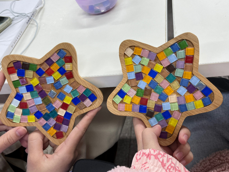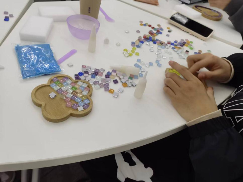 实践活动过程中,老师首先通过认识、感知、领悟3个环节深入浅出地向同学们讲解情绪变化与身心感受的关系,介绍了表达性艺术治疗的相关知识。随后通过手工制作马赛克杯垫这一“值得静思,需要耐心”的艺术工作,指导员工们充分发挥创造性和想象力,完成各自的马赛克杯垫作品。
