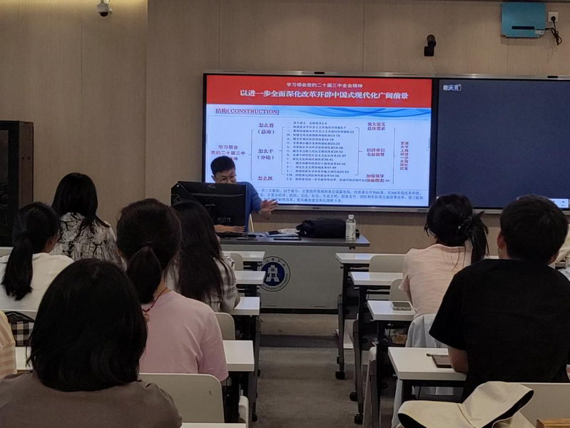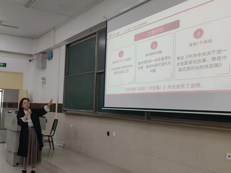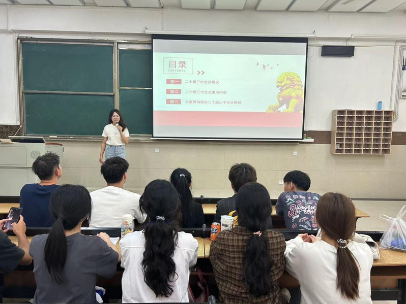 在校特研会总会,陈翠翠老师以新中国从工业化初期的历史阵痛到如今现代化建设非凡成就的巨大转变为例,以进一步全面深化改革、推进中国式现代化为主线,展开对中国新发展战略与二十届三中全会精神的讲述,并鼓励员工们要坚定信念,紧跟党的步伐,将个人发展与国家命运紧密相连。